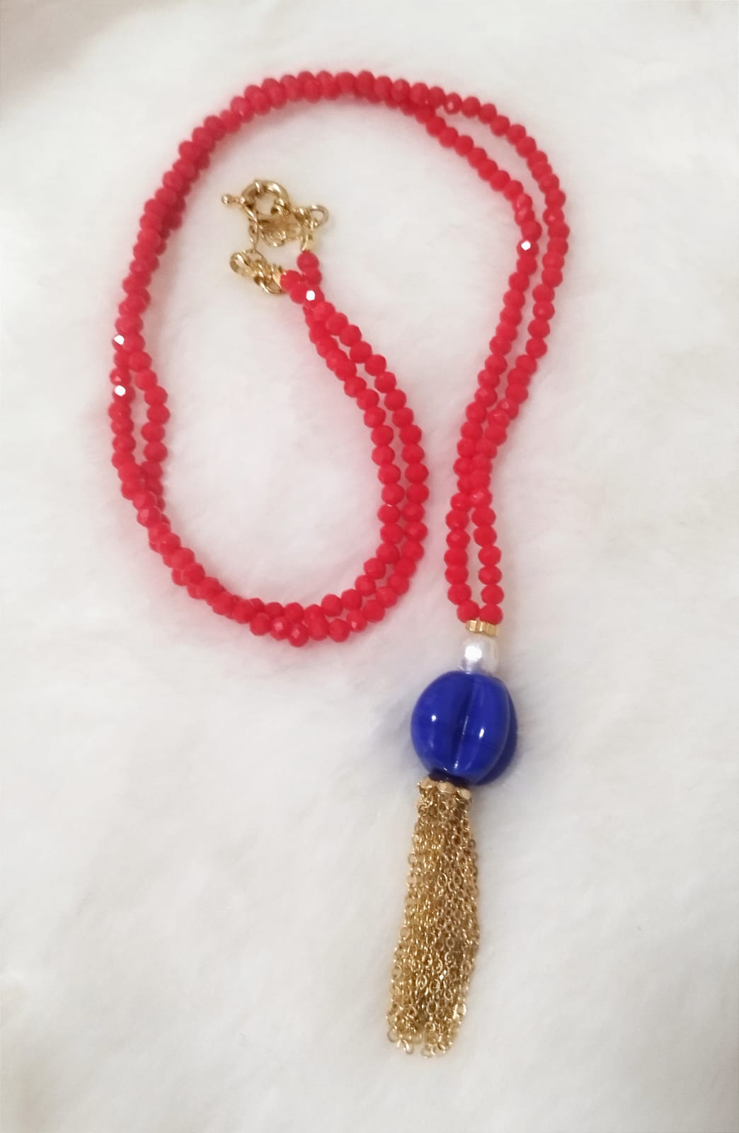 Colar longo com mini cristais coral vibrante, pedra azul e detalhes dourados.