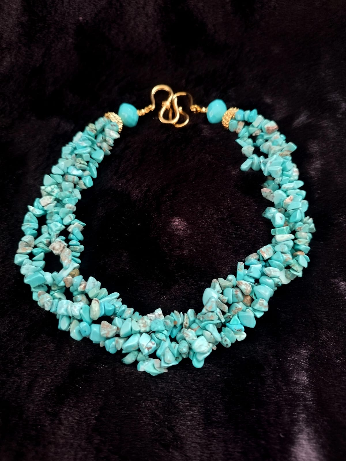 O colar de pedras naturais é uma peça de presença, com a cor vibrante tiffany. Para um visual magnífico e exclusivo.