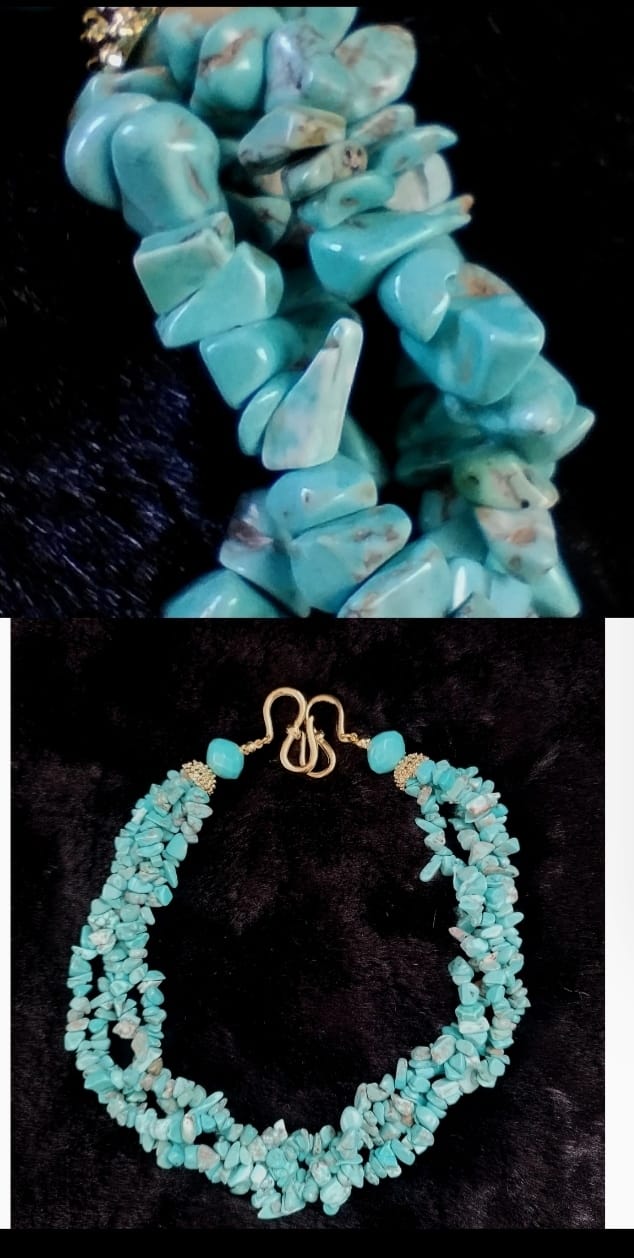 Colar curto 4 em 1 de pedras naturais na cor tiffany e detalhes em dourado.