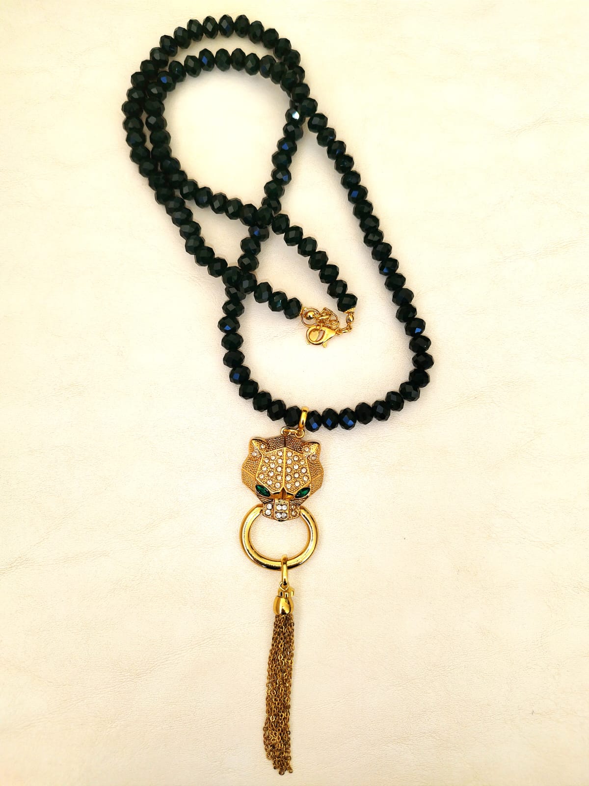 Colar extra longo de cristais verder com pingente de tigre e dourado com chuveirinho na ponta de correntinhas.