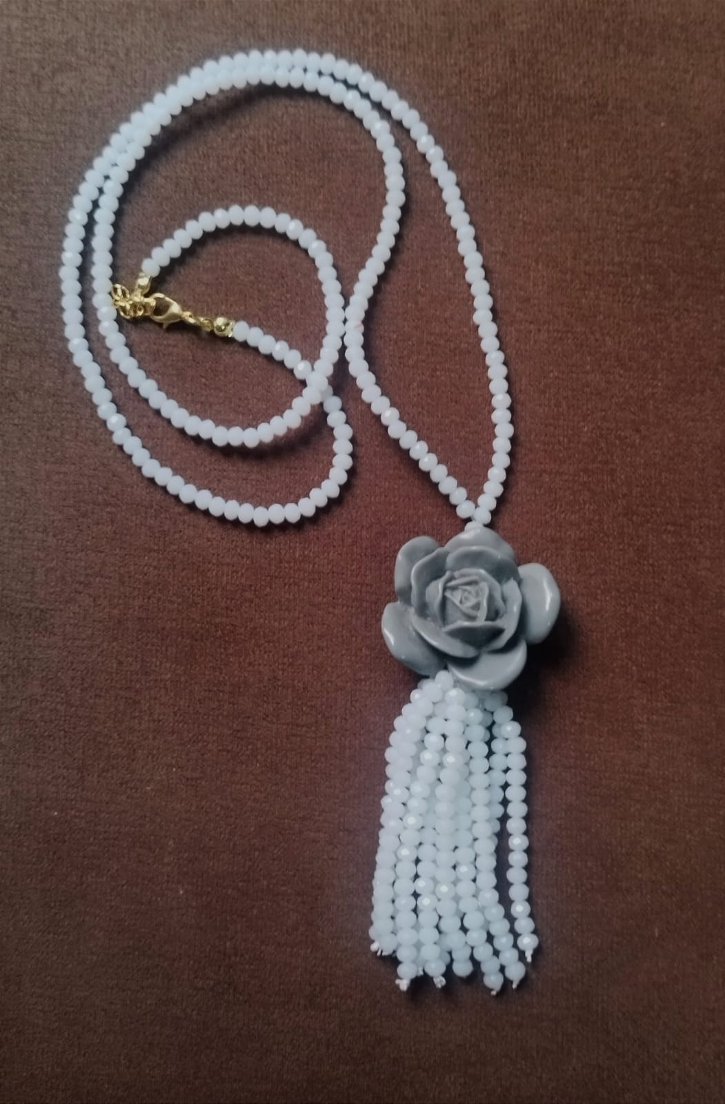 Colar extra longo de minicristais brancos com rosa de resina cinza e chuveirinho de minicristais brancos.